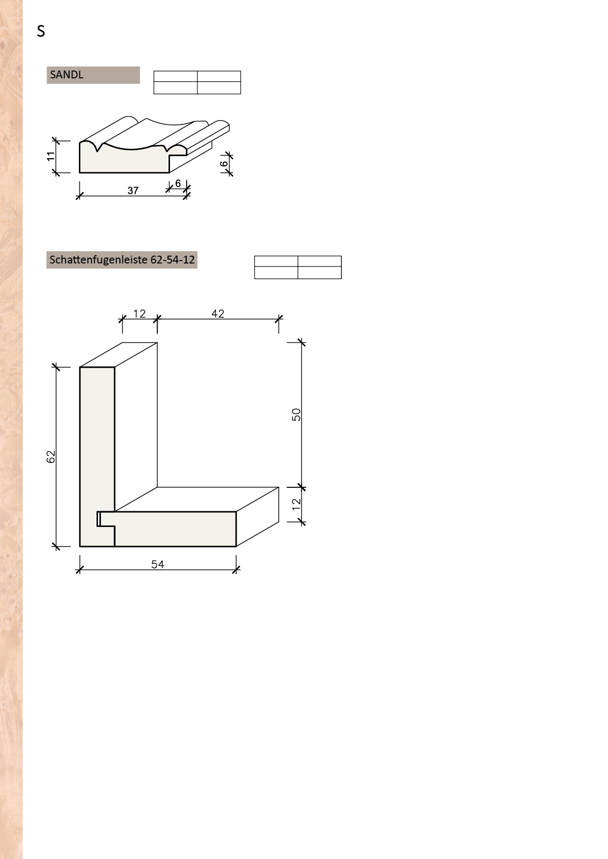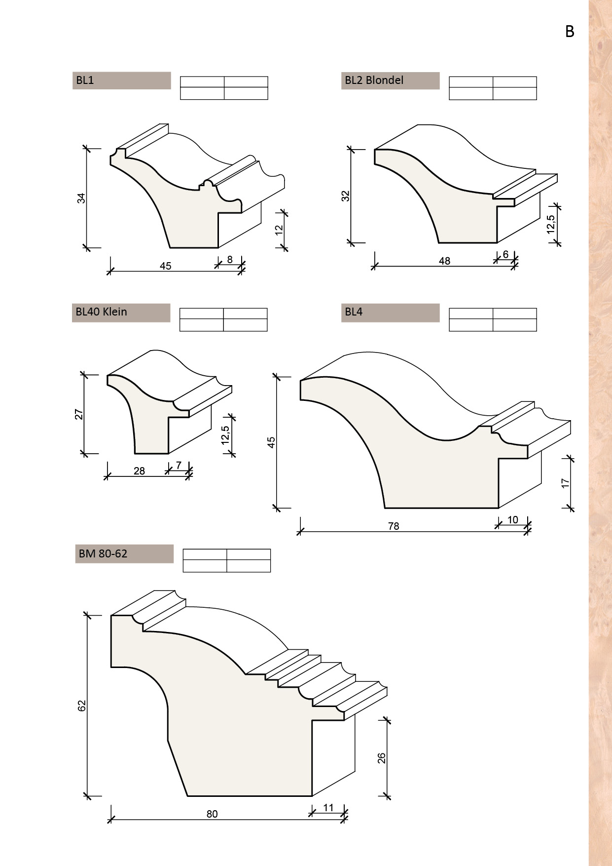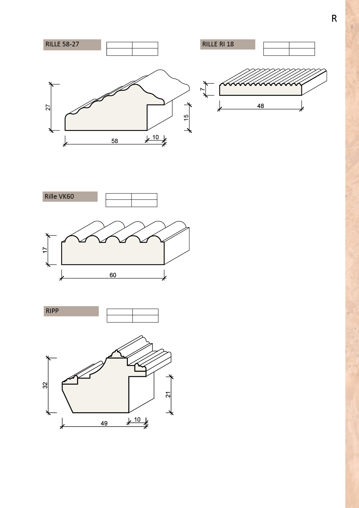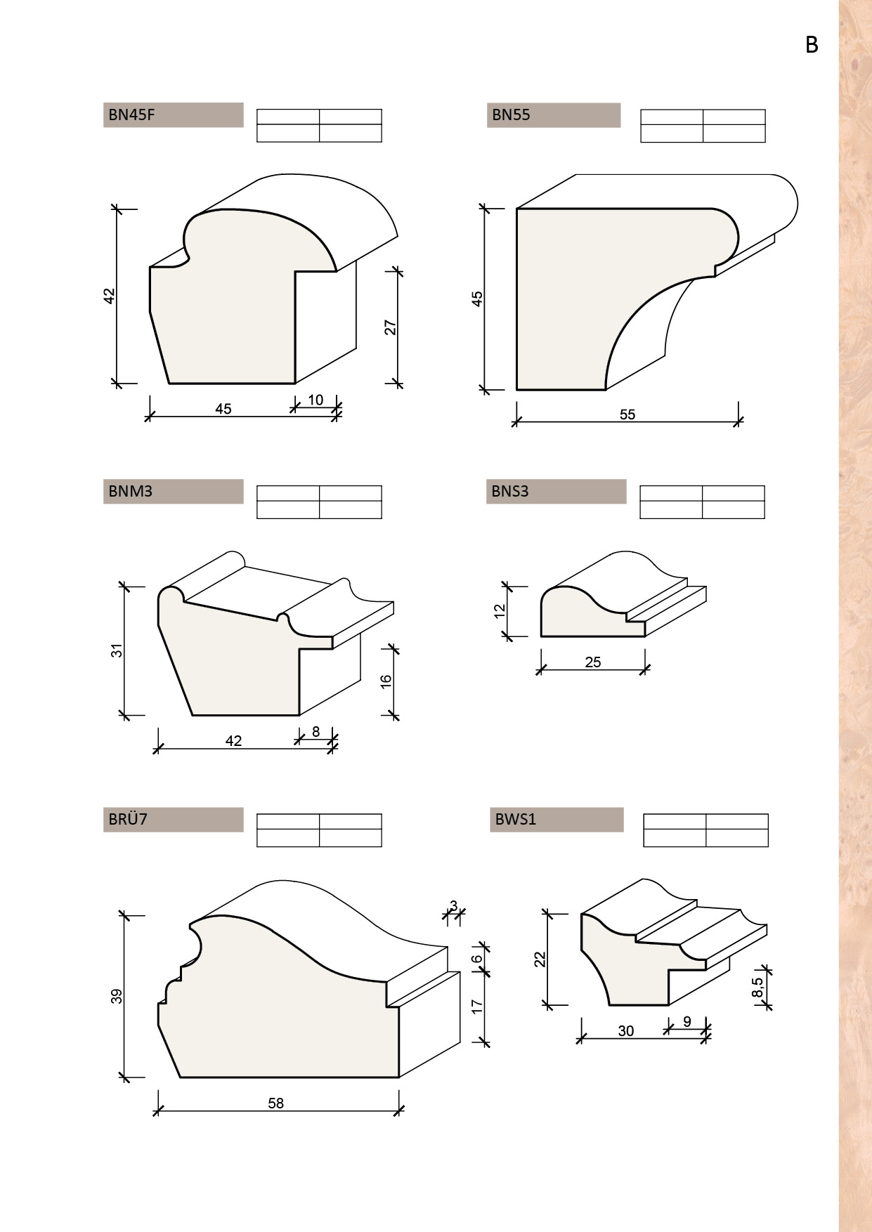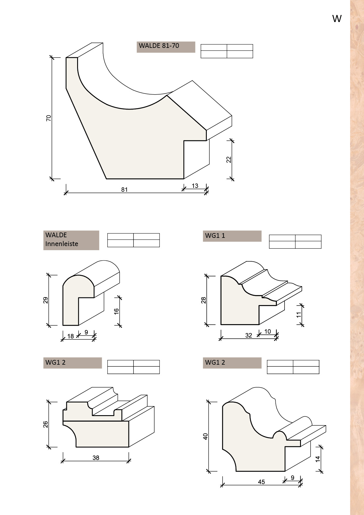 Flach- und Rillenleisten, Albertina-, Walde- und Hoffmannleisten, Profilleisten für Plattenrahmen, Kanneluren Leisten, Zahnleisten;…